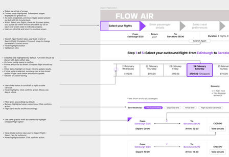 Reflecting on the user feedback from the flight selection stage, a more detailed progress indicator at the top of the page, and a visible identifier ‘Step X of X’ has been introduced because of the greater number of interactions and screen states within this stage.